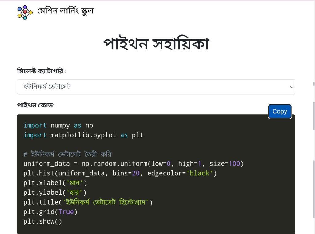 পাইথন সহায়িকাতে তুমি মেশিন লার্নিংয়ের পাইথন কোডসমূহ দেখে নিতে পারো।